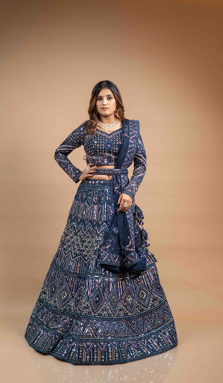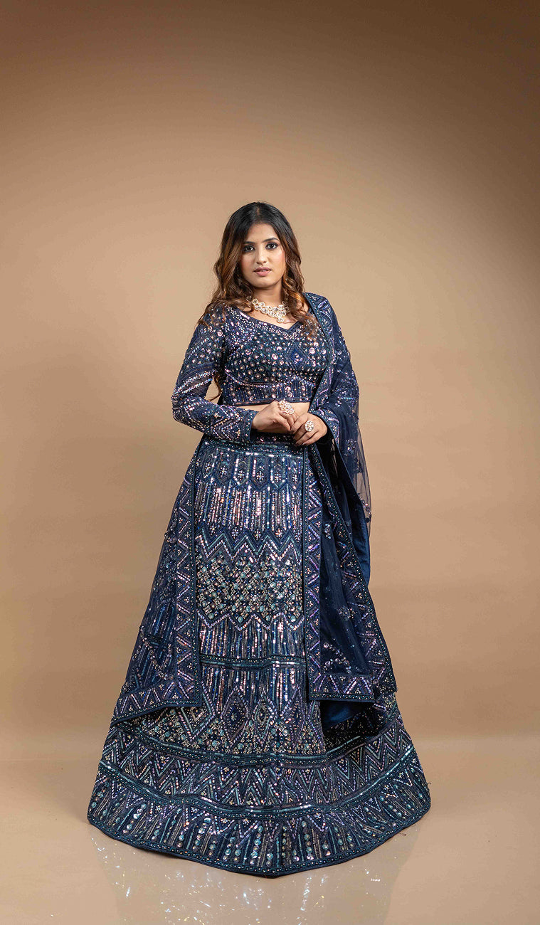 Sapphire blue lehenga set with heavy sequin and mirror embroidery with iridescent and silver detailing, gives it a reflective, multi-tone shimmer under light. The Dupatta and Belt is a matching navy blue net with embroidered accents.