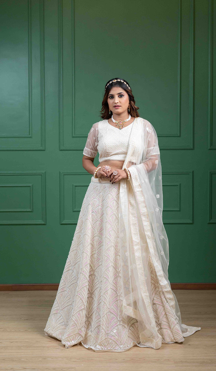 Off White lehenga set with multicolored katdana embroidery. Heavy embroidery of conical pattern.